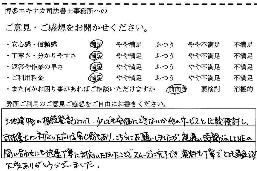 家の相続登記でお世話になりました。やり取りがSNSなので、通勤途上の電車内など隙間時間でできとても助かりました。説明も丁寧にしていただいたので不安になることもなく、スムーズに進みました。次回もお願いしたいと思います。