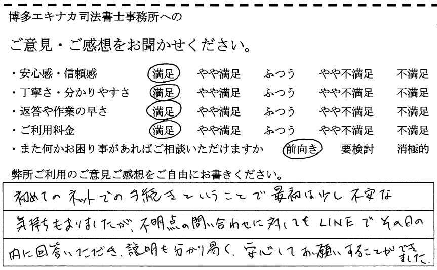 LINEのやり取りは細かな点まで読み返すことができて良かったです。山野先生は元県庁とのことで、分かりやすい説明文を書くのも慣れていらっしゃる印象です。お電話のあとも、内容の概要をLINEで送ってもらえたので、安心して手続きをお願いできました。