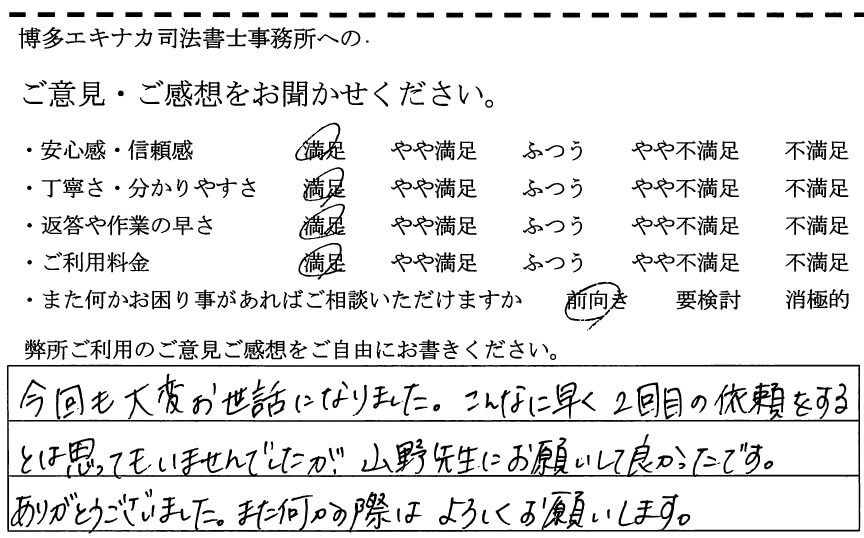 次、機会がありましたら、是非とも手続の代理を依頼したいと感じました。